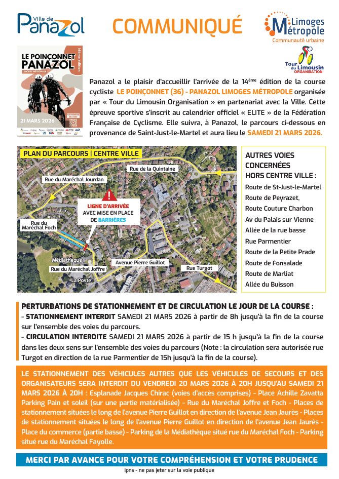 La Ville de Panazol aura le plaisir d’accueillir l’arrivée de la 14ᵉ édition de la course cycliste Le Poinçonnet (36) – Panazol Limoges Métropole, organisée par Tour du Limousin Organisation, samedi 21 mars 2026. Cette épreuve figure au calendrier Élite de la Fédération Française de Cyclisme.