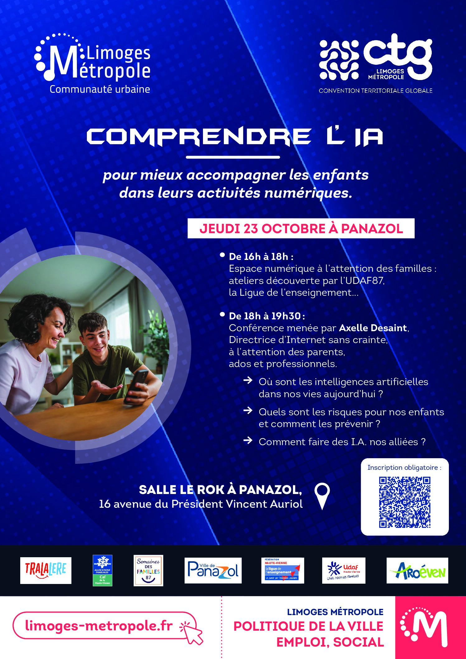 Dans le cadre de la Convention Territoriale Globale Limoges Métropole et des Semaines des Familles organisée par la Caf87, une conférence « Comprendre l’intelligence artificielle pour mieux accompagner les enfants dans leurs activités numériques », est organisée le jeudi 23 octobre au ROK.