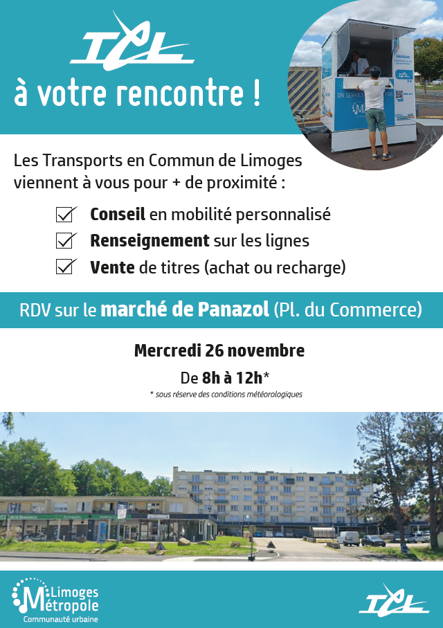L’Agence Mobile TCL vient à votre rencontre cette semaine ! Besoin d’un abonnement, de recharger votre titre ou d’infos sur le réseau ? Marché de la Ville de Panazol Mercredi 26 novembre 8h-12h